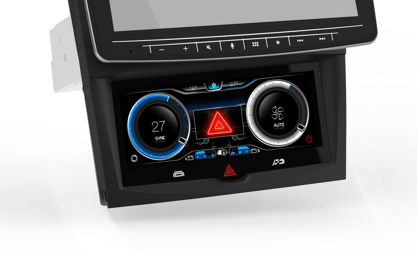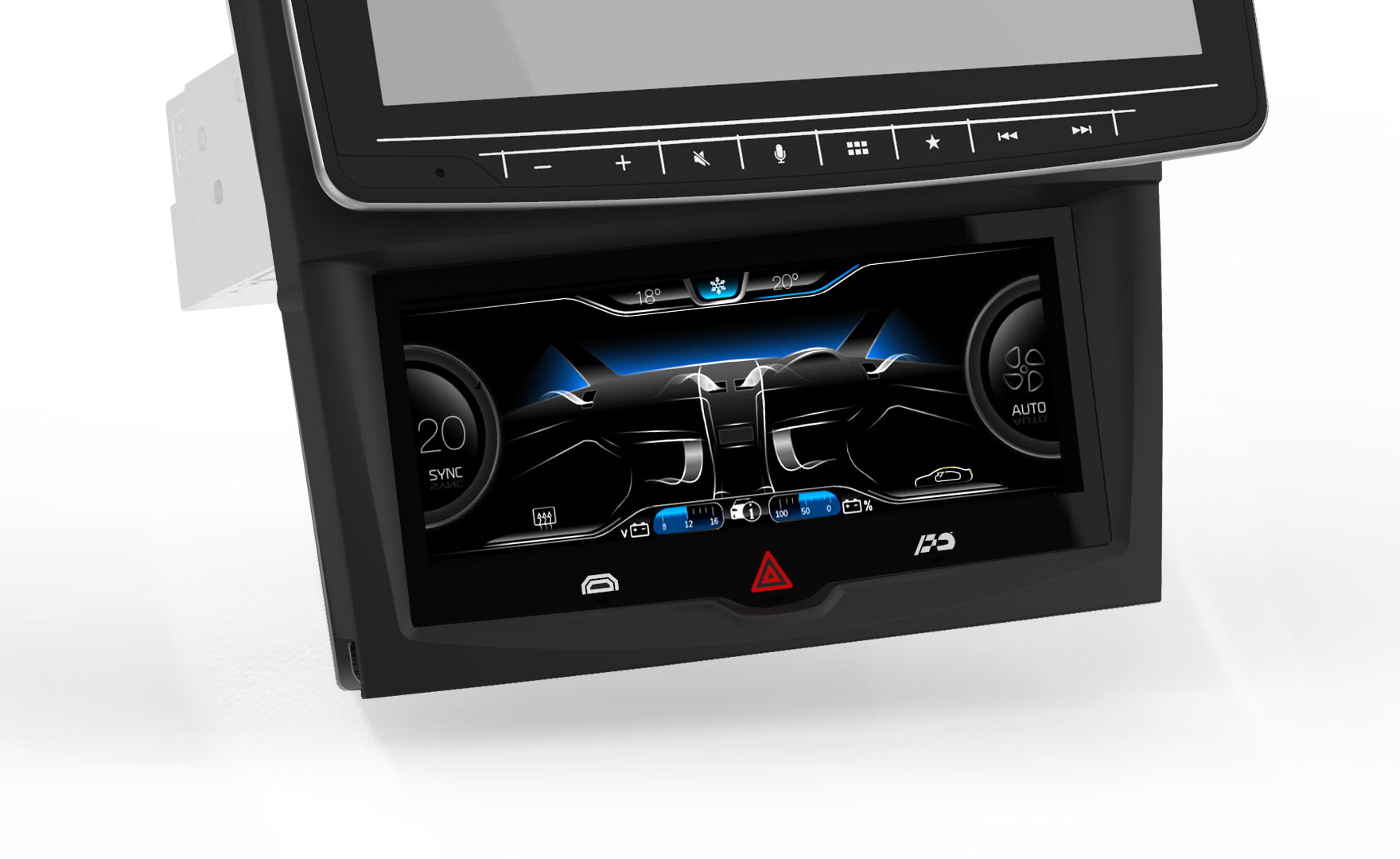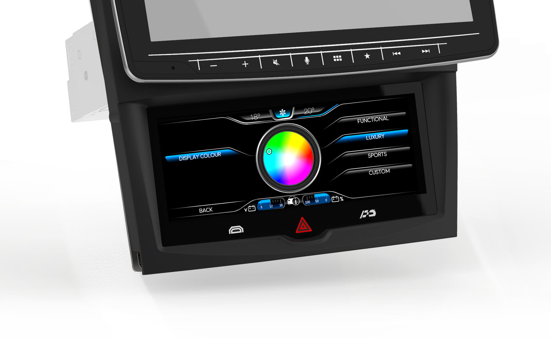 In the event of an emergency or alert situation the ‘Hazard’ hard key icon can be selected, when activated the GUI flashes on the display along with the vehicle blinkers. The Hazard hard key system is constantly awake and operationally, even if the climate system is turned off the Hazard system can be engaged at anytime.