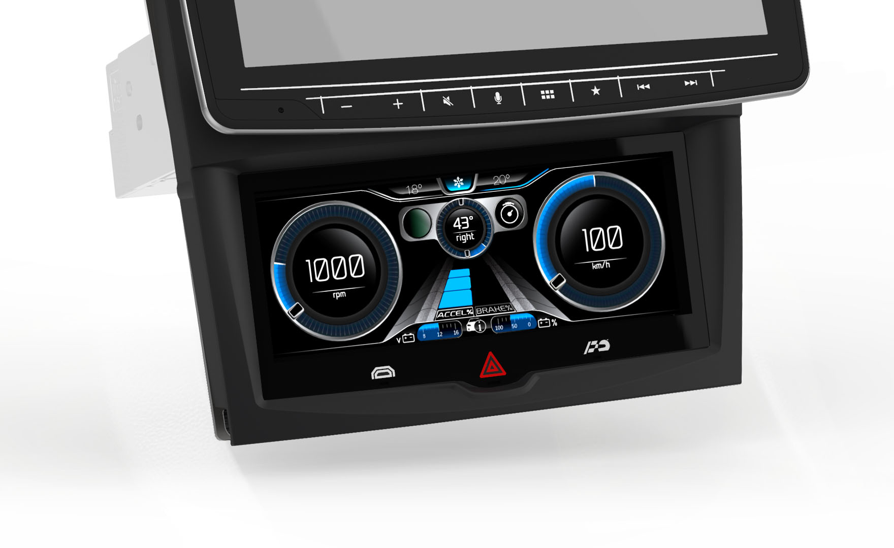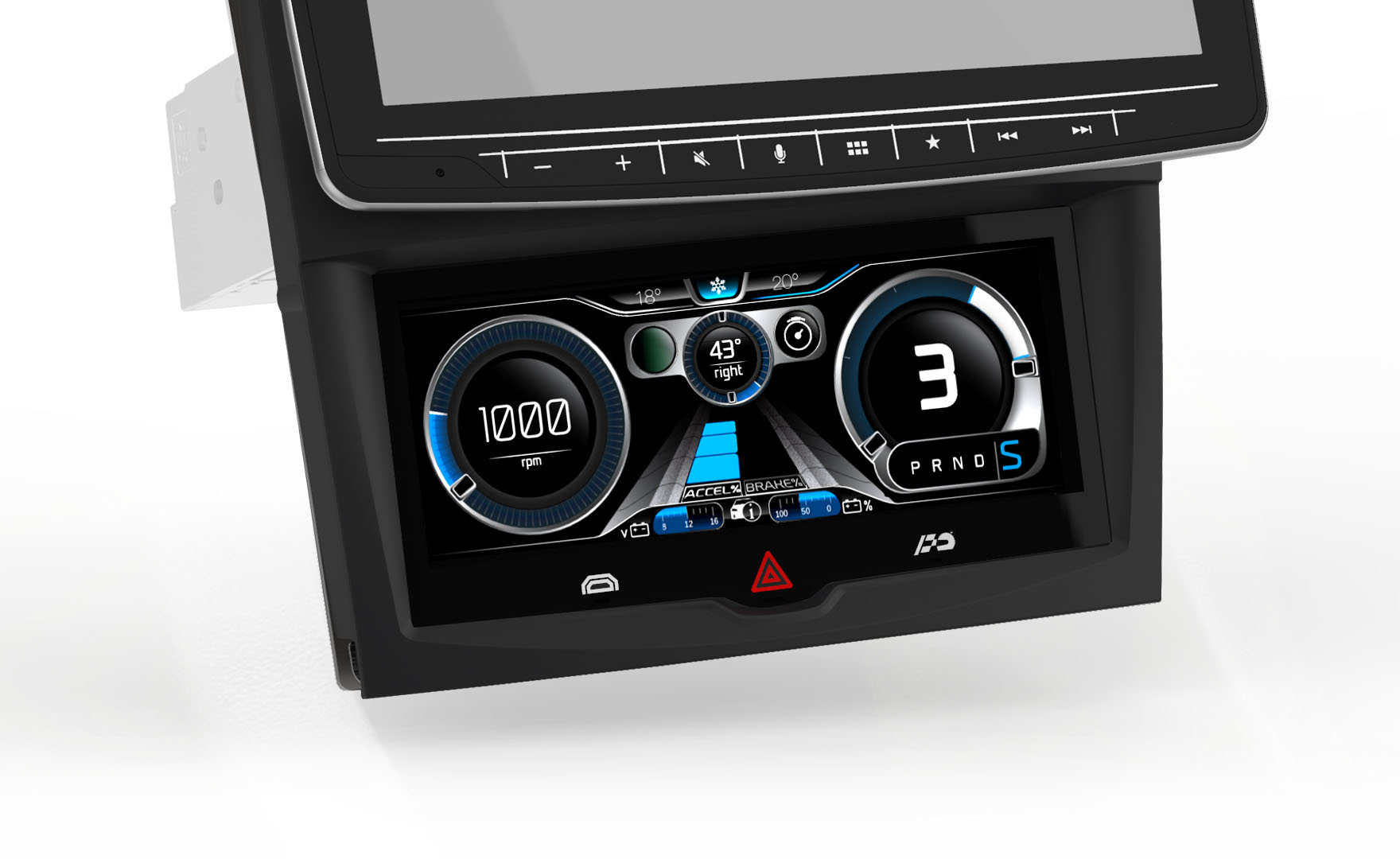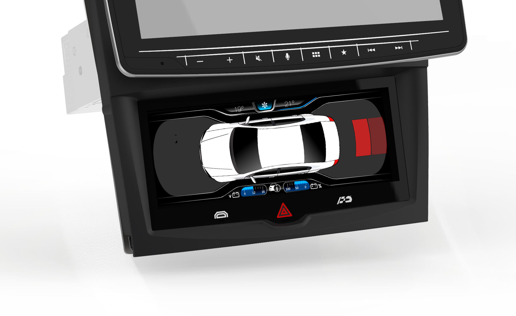 In the event of an emergency or alert situation the ‘Hazard’ hard key icon can be selected, when activated the GUI flashes on the display along with the vehicle blinkers. The Hazard hard key system is constantly awake and operationally, even if the climate system is turned off the Hazard system can be engaged at anytime.